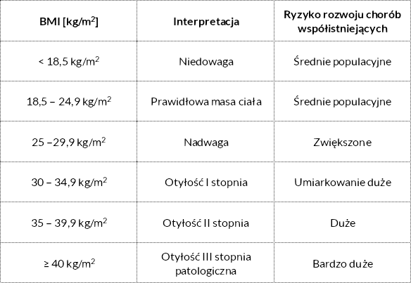 Powszechnie wykorzystywanym wskaźnikiem do rozpoznawania nadwagi i otyłości jest wskaźnik masy ciała BMI (ang. Body Mass Index), który definiowany jest jako stosunek masy ciała do kwadratu wzrostu (kg/m2). Poniżej przedstawiono wzór na obliczanie wskaźnika BMI oraz jego interpretację w tabeli.